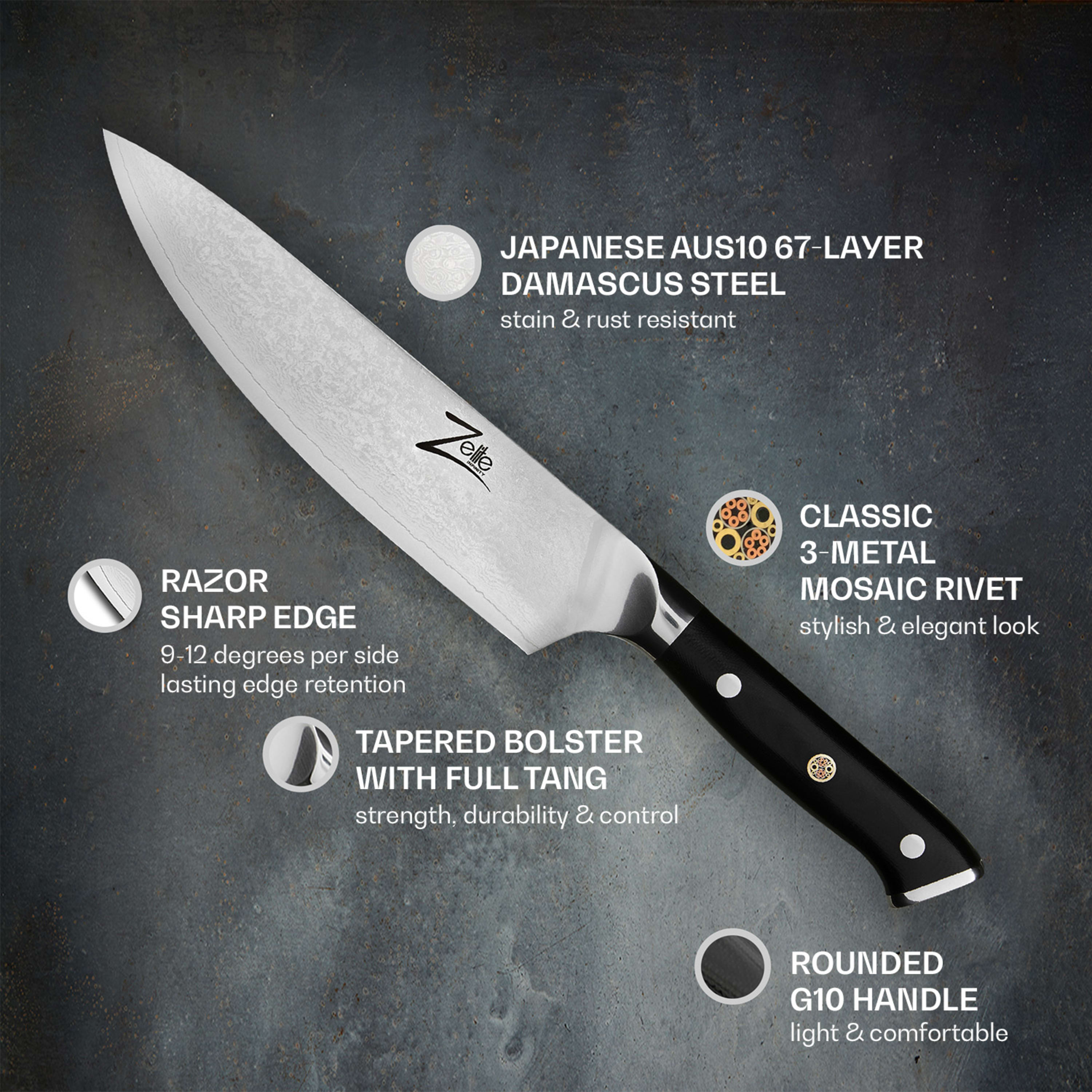 Екслузивни и прецизни ножове по японски образец: ръчно наточената серия ножове Zelite Infinity by Klarstein Alpha-Royal Japanese изпълняват високите изисквания на всяко кулинарно изкуство. Преливащото се острие се състои от общо 67 слоя много качествена японска дамаска стомана. Благодарение на своята продълговата и ергономична форма и гладката дръжка от стъклено влакно G10 с три нишки, този кухненски инструмент седи съвършено в ръката. Тук се съчетават острота, устойчивост, тегло, управление и манипулация с изключителен дизайн, който е усъвършенстван от 3 красиви метални мозаечни нишки в дръжката.