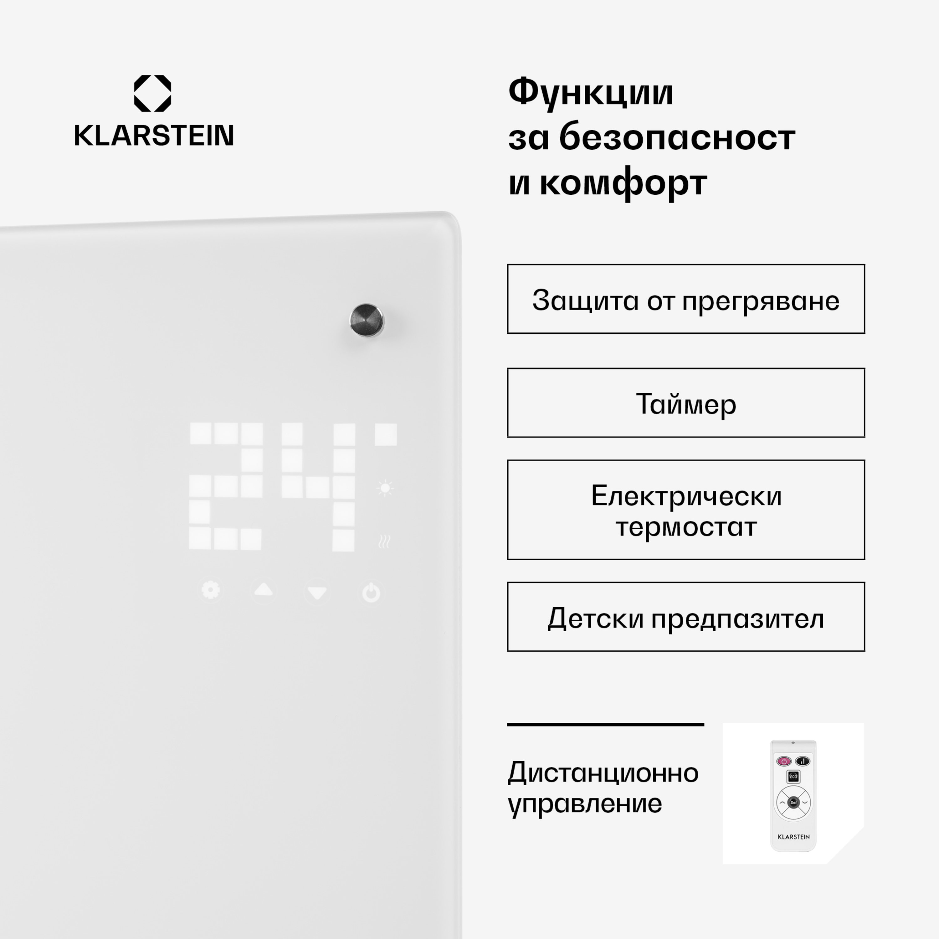 На сензорният екран в горния десен ъгъл на стъкления панел може лесно да настроите желаните функции на нагревателя. На дисплея се показва и стайната температура. Дистанционното управление улеснява работата на нагревателя, когато сте удобно потънали в креслото.