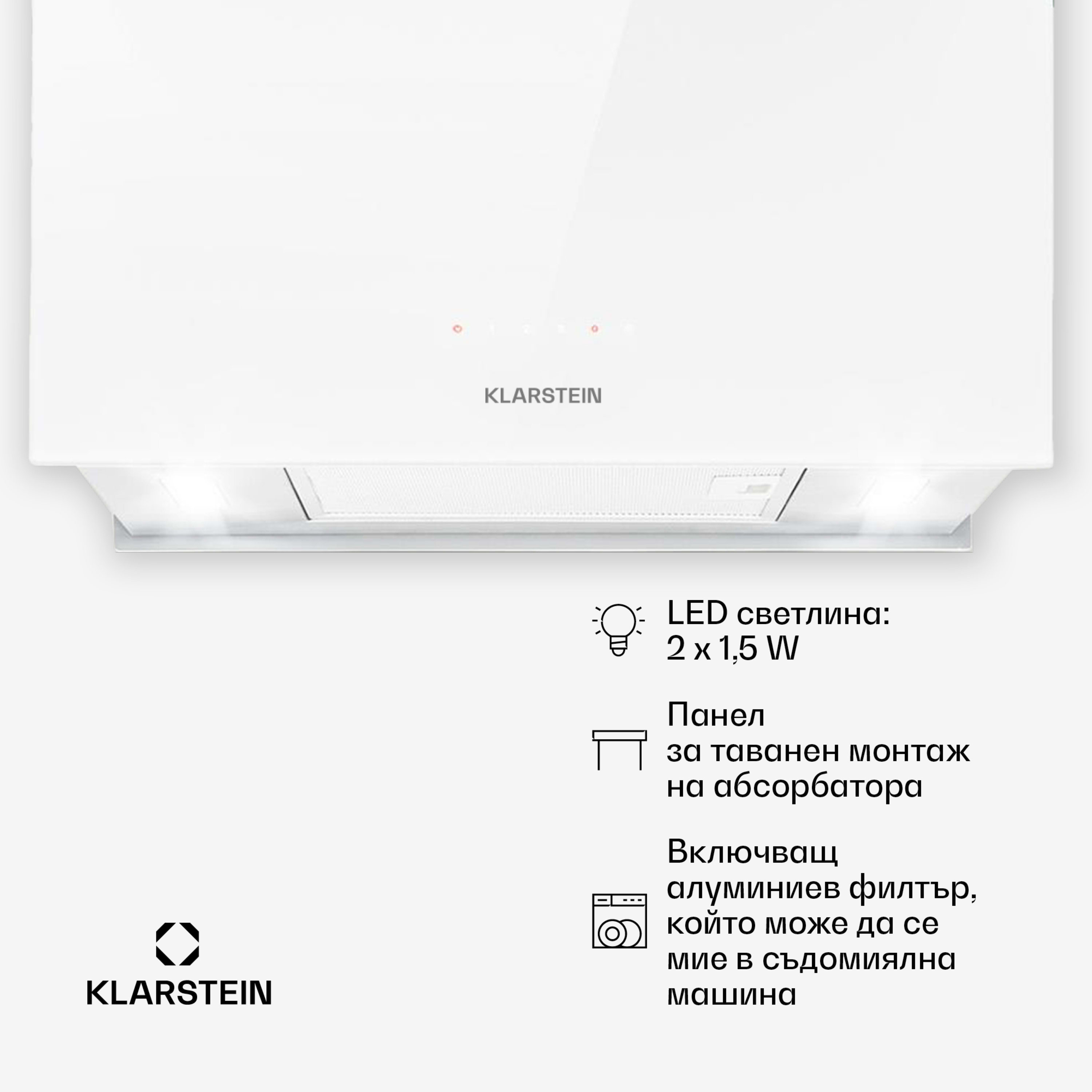 Островният абсорбатор Klarstein Kronleuchter L се характеризира с елегантен външен вид. Предната и задната част на устройството изпъкват благодарение на луксозното бяло защитно стъкло а страните са изработени от неръждаема стомана.