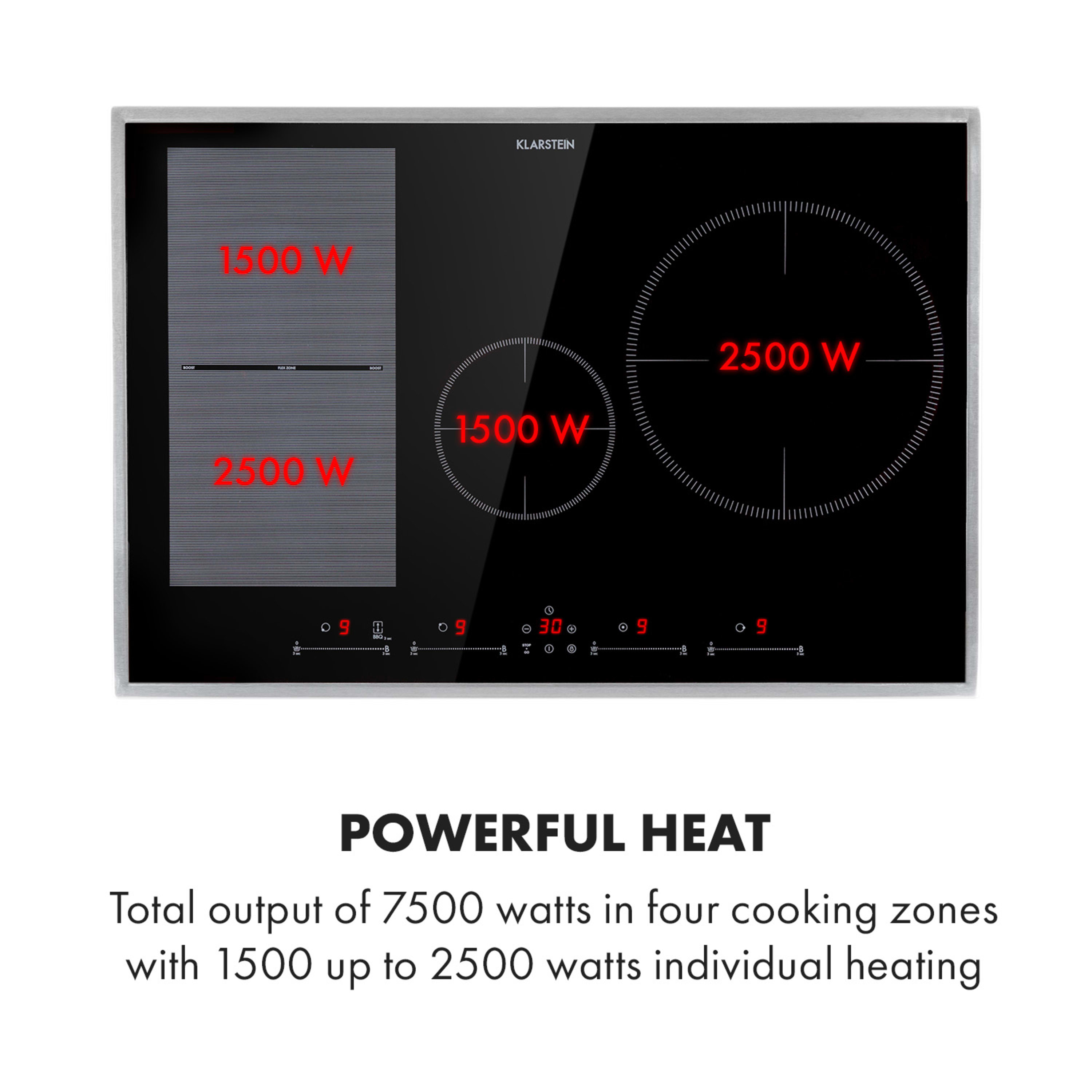 Мощност на топлина: обща мощност 7000 W на четири зони за готвене с индивидуални мощности 2000 W и 1500 W