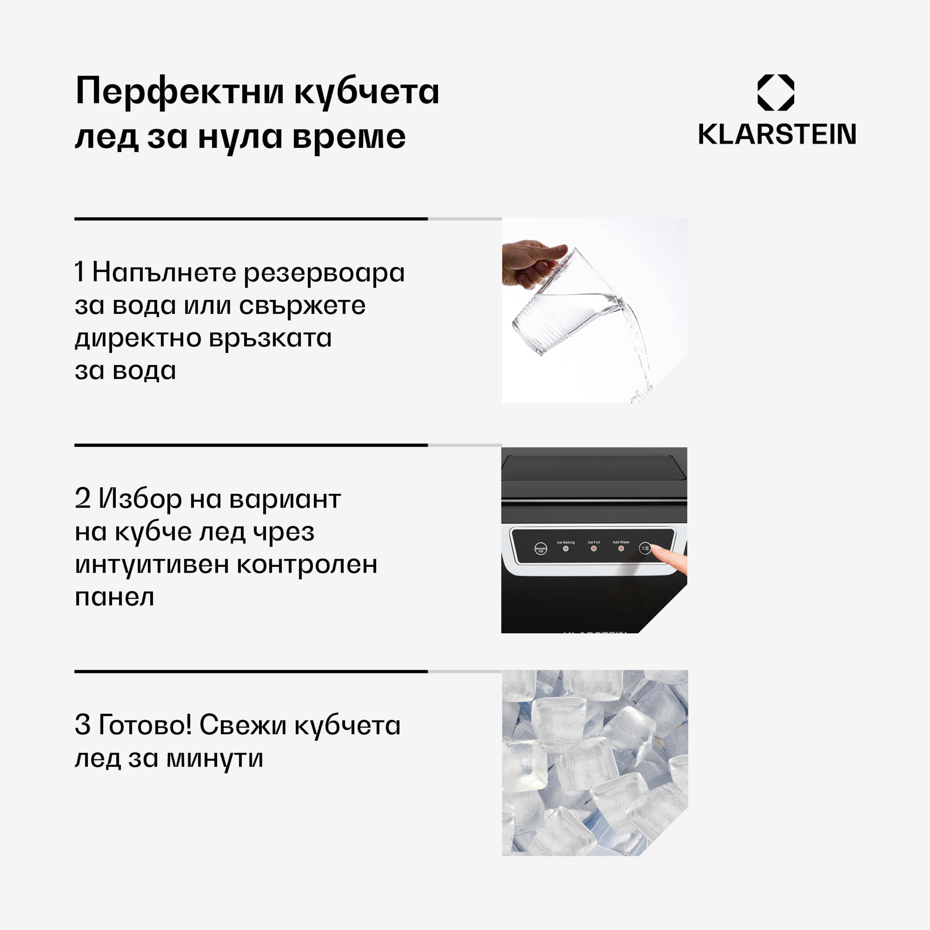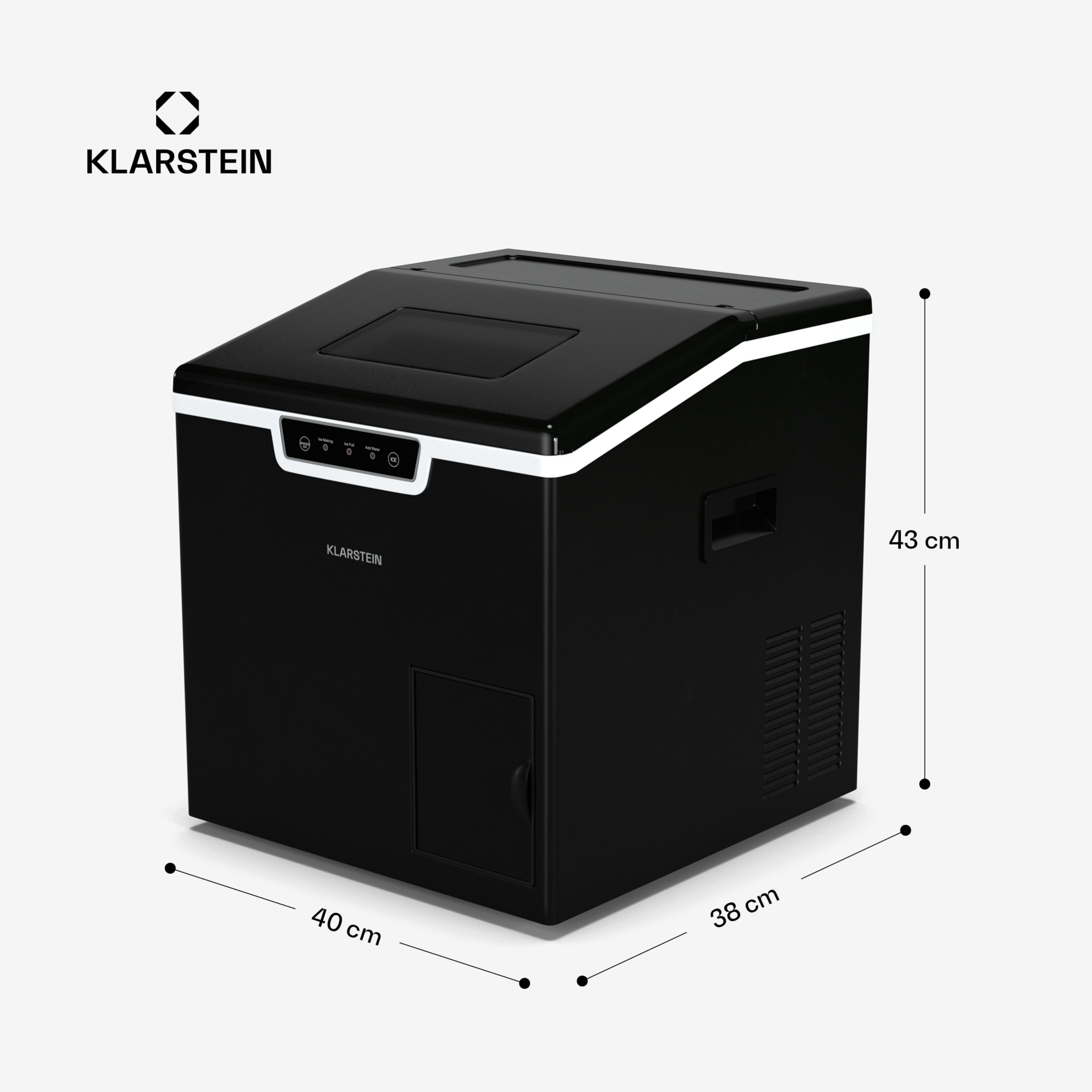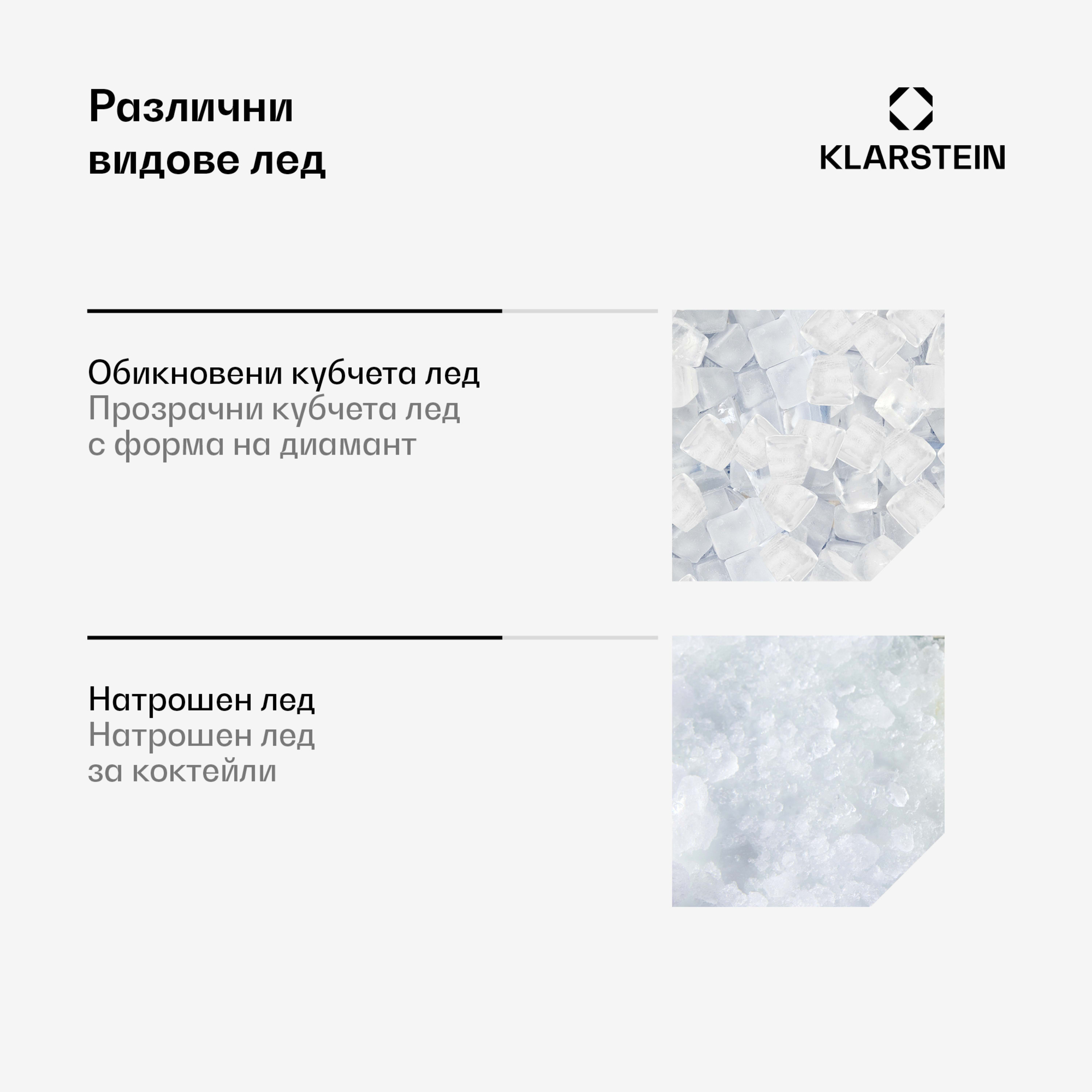 Уредът за производство на кубчеталедKlarstein Icefestival със своя високопроизводителен компресор лесно снабдява барове, ресторанти, събития и щандове за пресни храни с необходимите кубчета лед за охладени напитки или за охлаждане на храна.