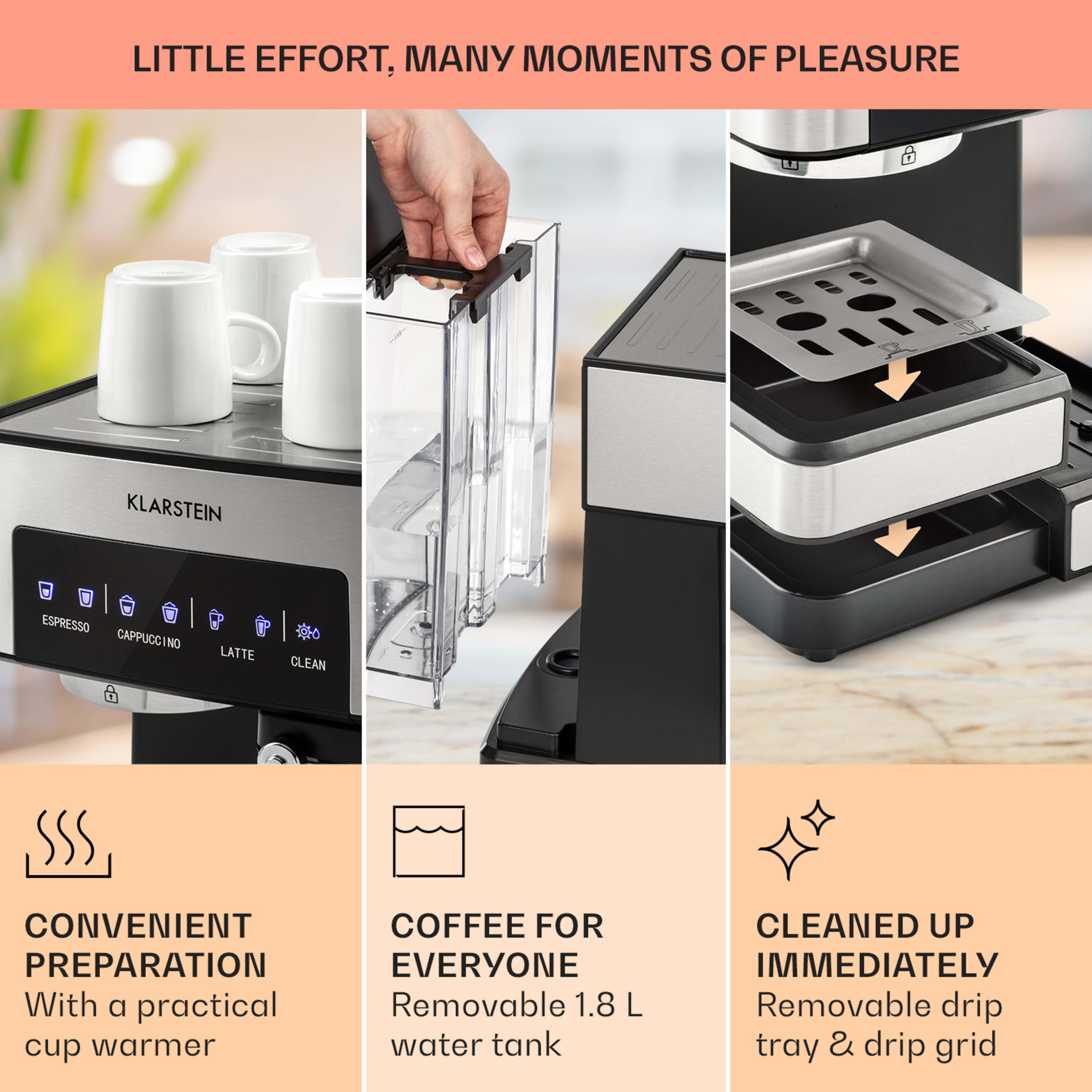 За любителите на кафето: наслади се на страхотно еспресо, капучино или лате макиато от еспресо кафемашина Klarstein Arabica Comfort, което имаш на разположение с едно натискане на бутона. Благодарение на 90° неръждаем уред за пяна и подвижния съд за мляко можеш винаги да регулираш производството на млечна пяна. Освен това при всяко приготвяне можеш да избереш дали да приготвиш кафе от смляно кафе или от капсули. И почистването е много лесно, благодарение на подвижния 1,8-литров съд за вода и измиващата се решетка за отцеждане.