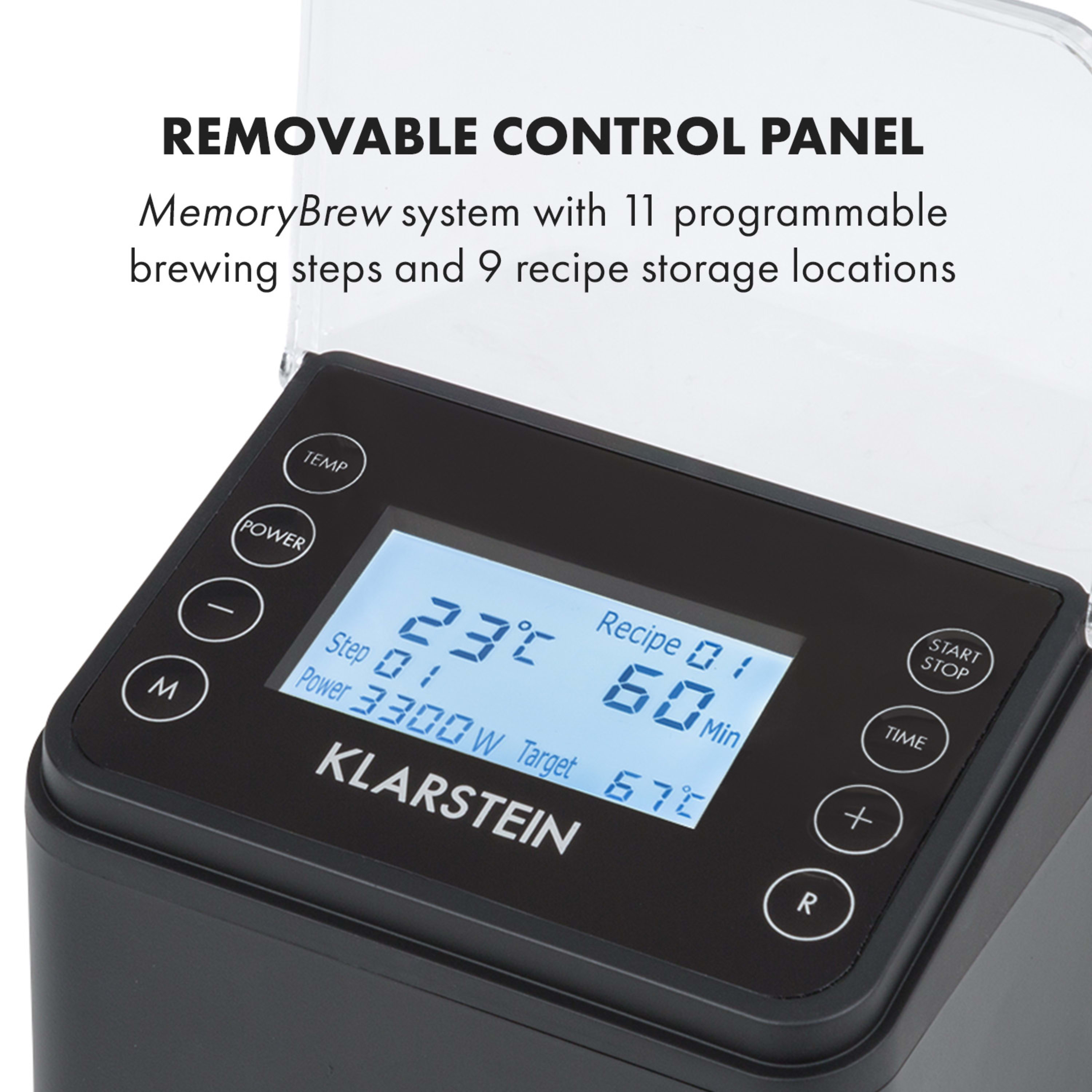 Без значение дали става дума за начинаещ или опитен пивоввар, малцовият котел Klarstein Brauheld Pro предлага лесен начин за приготвяне на бира. Посредством панела за управление с LC дисплей можете да настроите точната температура, времето за приготвяне и мощността. Изключително практична е и системата MemoryBrew. Лесно програмирайте и запазете до 11 стъпки на приготвяне. Гатантират се еднакви резултати и при повече процеси на варене. 9 места за запомняне на рецепти улесняват процеса приготвяне. Тези, които искат да започнат с производтсвото веднафа, могат да използват една от от четирите запазени рецепти за по-слаба и по-силна бира, отлежала силна бира или пшенична бира. Единицата за управление е свързана с котела с помощта на кабел и може да се извади лесно.