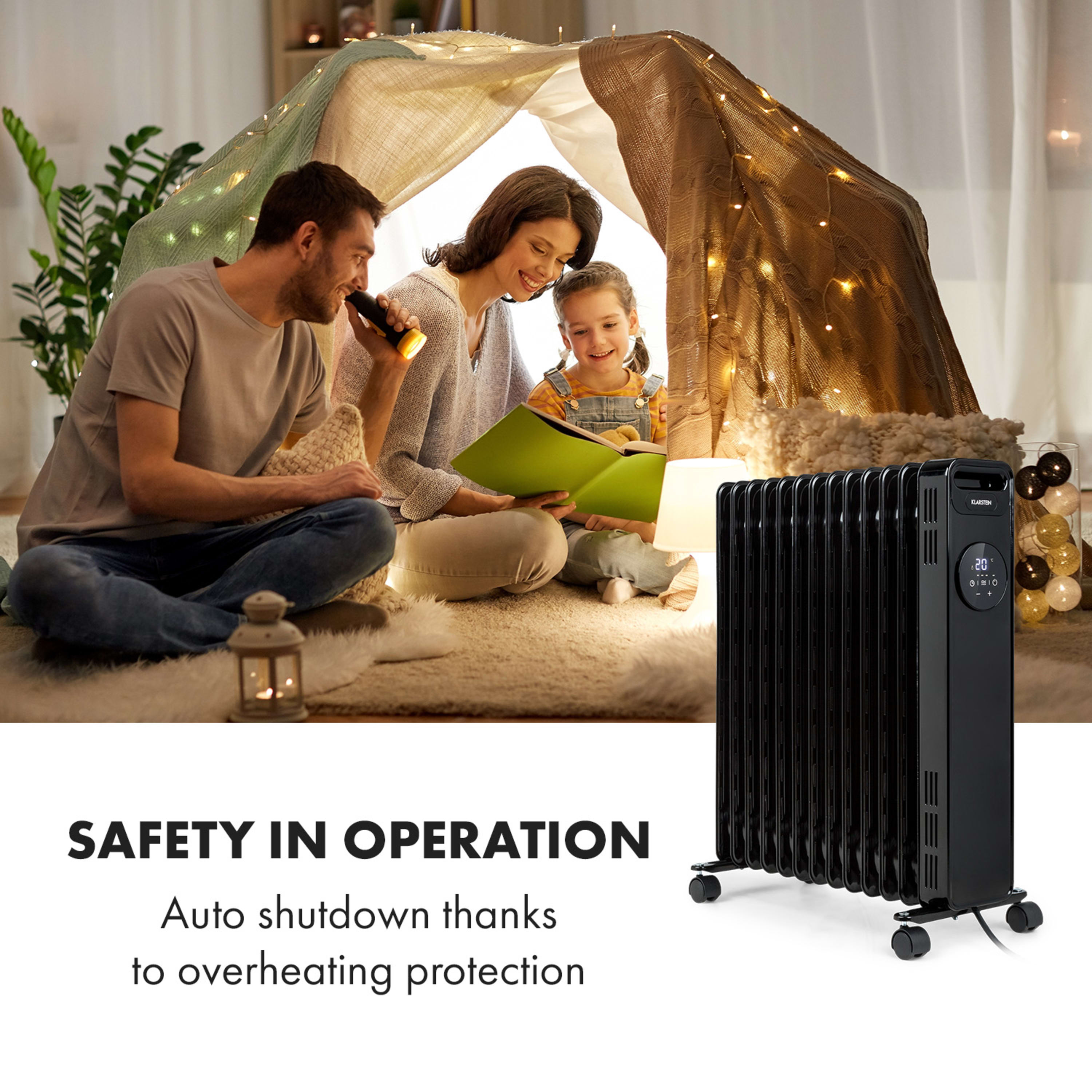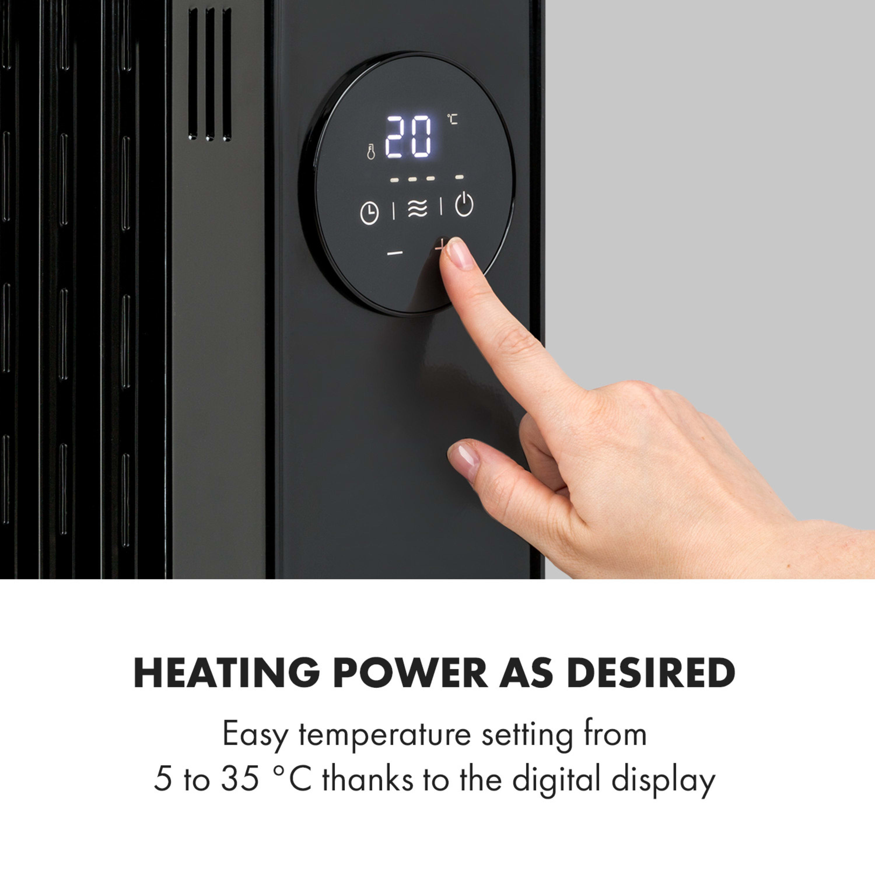 С мощност 2500 ще осигури бързо затопляне и равномерна температура от 5 до 35 ° C. Имате на разположение три нива на загряване. Управлението на масления радиатор Klarstein Thermaxx Heatstream е изключително лесно: благодарение на LED дисплея и електронният контрол можете винаги бързо да определите желаната температура, отоплителният режим и включване/изключване. Новата система Hyperheat със специални отвори за въздух в дванадесетте отоплителни ребра не само осигурява изключително голяма нагревателна повърхност, но също така позволява изключително бързо загряване на въздуха в помещението, благодарение на значително по-добрата циркулация на въздуха. Случайният контакт с радиатора е безболезнен, тъй като горният капак на устройството и подобрената ребриста структура предотвратяват силно нагряване на повърхността.