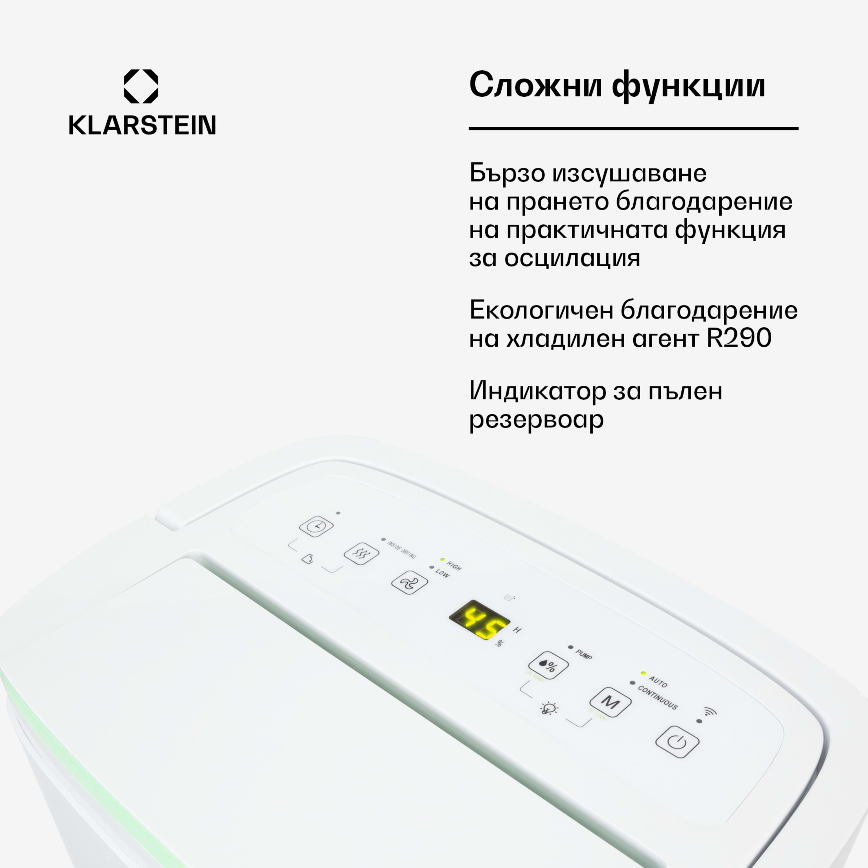 - Регулируема целева влажност с 5 % в стъпки от 30 до 80 %
