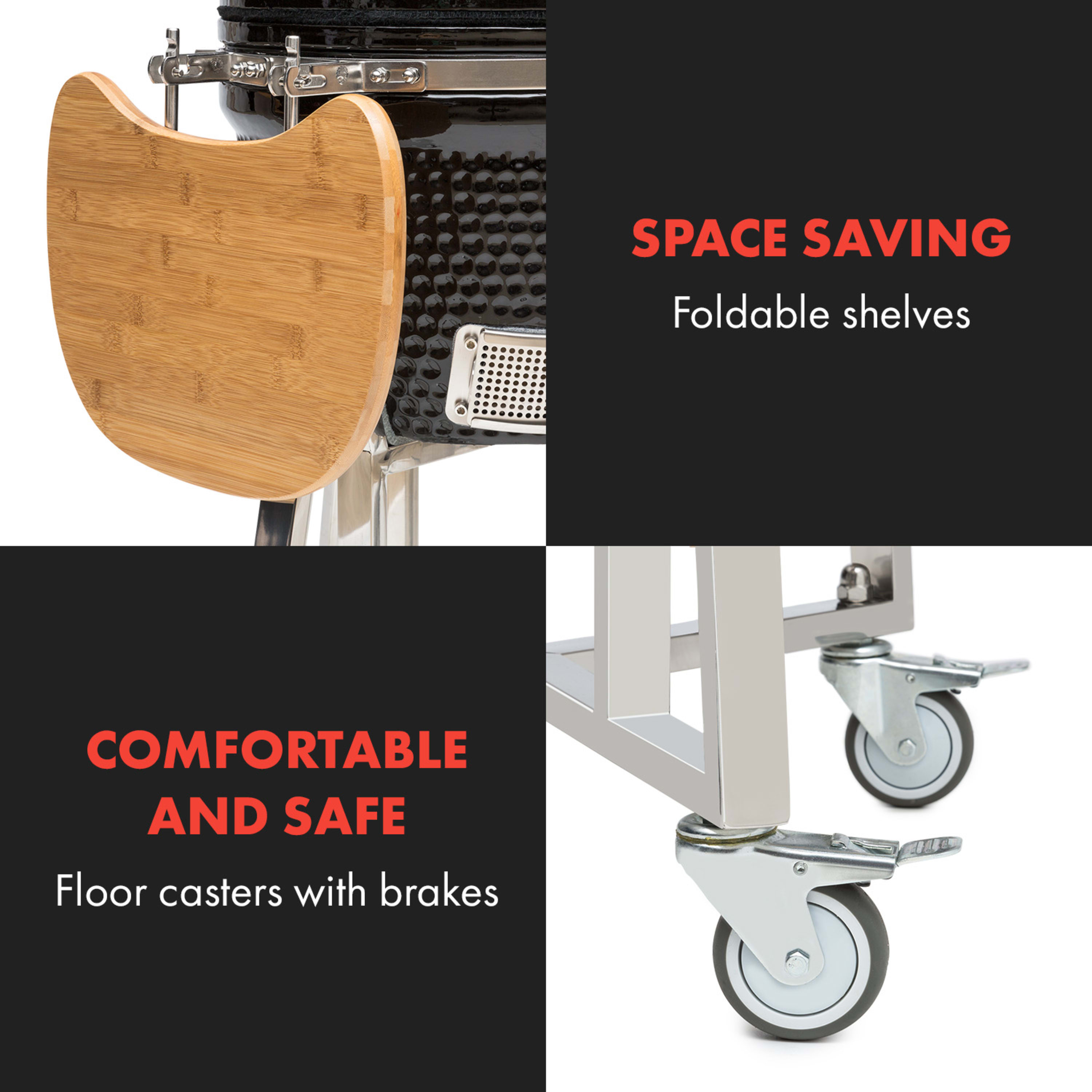 Материалът и формата на камадо керамичния грил Queensize на компанията Klarstein са измислени така, че грилът да запазва влагата във вътрешността, за да не изсъхне месото дори и след по-продължителен процес на готвене и да остане особено сочно при сервиране на масата. Двете поставки от двете страни на купола на скарата осигуряват достатъчно място за поставяне на храна, прибори или напитки. Здравата конструкция от неръждаема стомана придава на скарата безопасна и сигурна позиция и може да се вдигне до удобната работна височина, докато трите монтирани колелца улесняват предвижването на скарата.