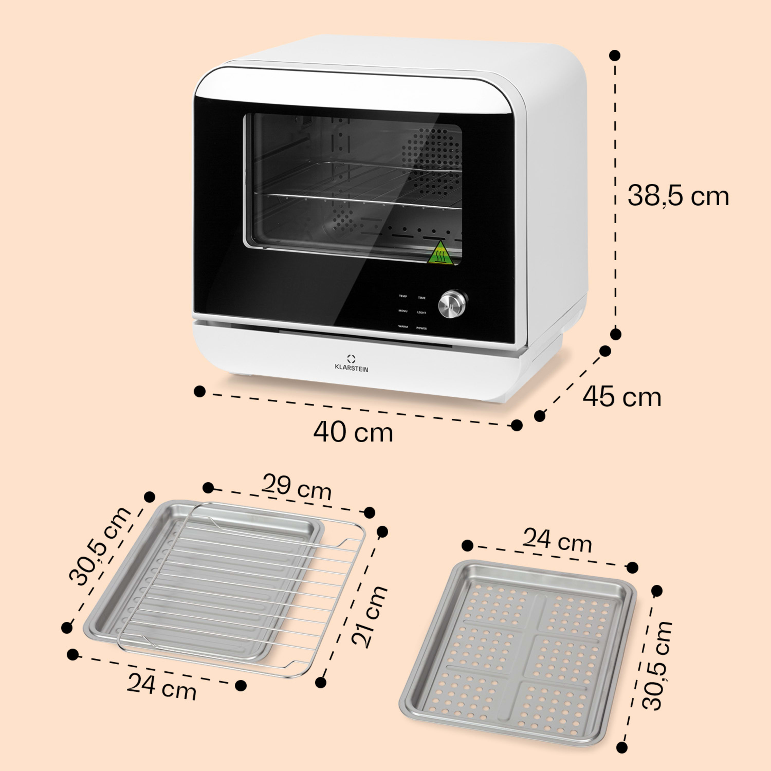 Голямото 18-литрово вътрешно отделение ще изпълни всяко желание и може да побере дори цяло пиле на ротационен принцип. Фритюрникът на въздух Vita Pro от Klarstein е изключително компактен благодарение на дизайна си на мини фурна. Издърпващото се чекмедже в предната част има вграден резервоар за вода с вместимост 800 мл за приготвяне на пара и тавичка за оттичане. Комплектът аксесоари е оптимално оборудван за всички приложения: включена е тава за грил, практична приставка за готвене на пара и тава за печене.